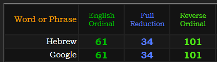“Google” also has significant overlap with “Hebrew”, were 101 is the 26th prime number, English is a Catholic language with 26 letters, and “God” and “YHWH” equate to 26 in English and in Hebrew.