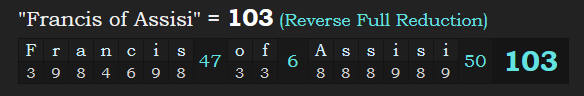 Notice also the name “Francis of Assisi” sums to 103, corresponding with the day he supposedly died on, 10/3, and the date that Pope Francis signed his encyclical. Pope Francis is named after this very same person.