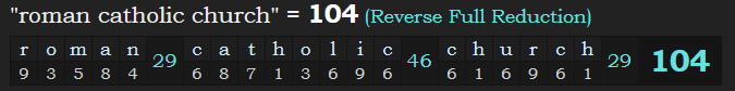 Something that I noticed after first publishing this article is that “Roman Catholic Church” = 104, corresponding with the day that Pope Francis revealed the encyclical to the world, 10/4.