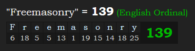 139 is the 34th prime number, corresponding with “Knights” Templar, “Hebrew” and “Holiest”, which is what these Masons pretend to be.