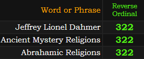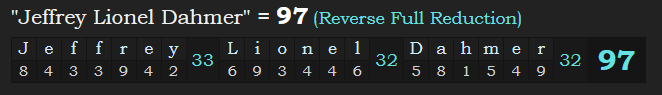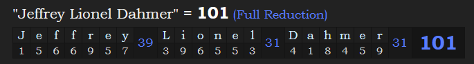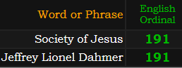 This is even more interesting when combined with the fact that his full name “Jeffrey Lionel Dahmer” = 191, just like “Society of Jesus” = 191.