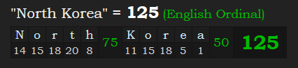 Notice also that when using the Masonic Calendar, North Korea was founded on a date with “North Korea” = 125 numerology.