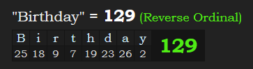 Notice also that May 9th is the 129 day of the year, corresponding with “Birthday” = 129.