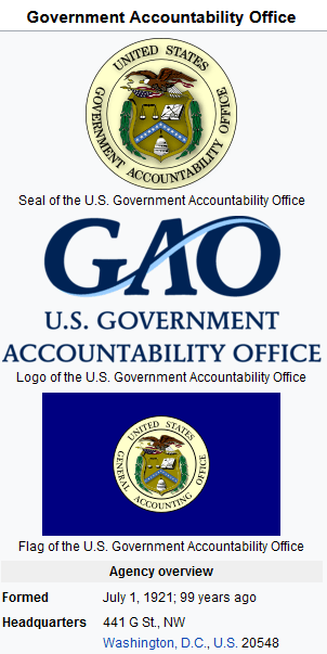 According to Wikipedia, “The U.S. Government Accountability Office (GAO) is a legislative branch government agency that provides auditing, evaluation, and investigative services for the United States Congress.[2] It is the supreme audit institution of the federal government of the United States. It identifies its core “mission values” as: accountability, integrity, and reliability.[3] It is also known as the “congressional watchdog”.[4]
