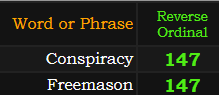 This was also a date with 147 numerology when using the Masonic Calendar, corresponding with “Freemason” = 147, and “Conspiracy” = 147.