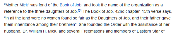 Job’s Daughters is a “secret society” for 10-20 year old girls who are either related to or sponsored by a Freemason to join. It was founded on October 20th, 1920 by Ethel T. Wead Mick.