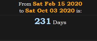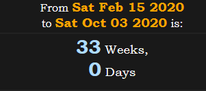 From Feb 15 2020 to Oct 3 2020 is a span of EXACTLY 231 days the 21st triangular number, or a span of EXACTLY 33 weeks.