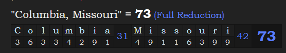 This ritual occurred the city of “Columbia, Missouri”, the headquarters of the “Grand Lodge of Missouri”, and the name of the town sums to 73 as well.